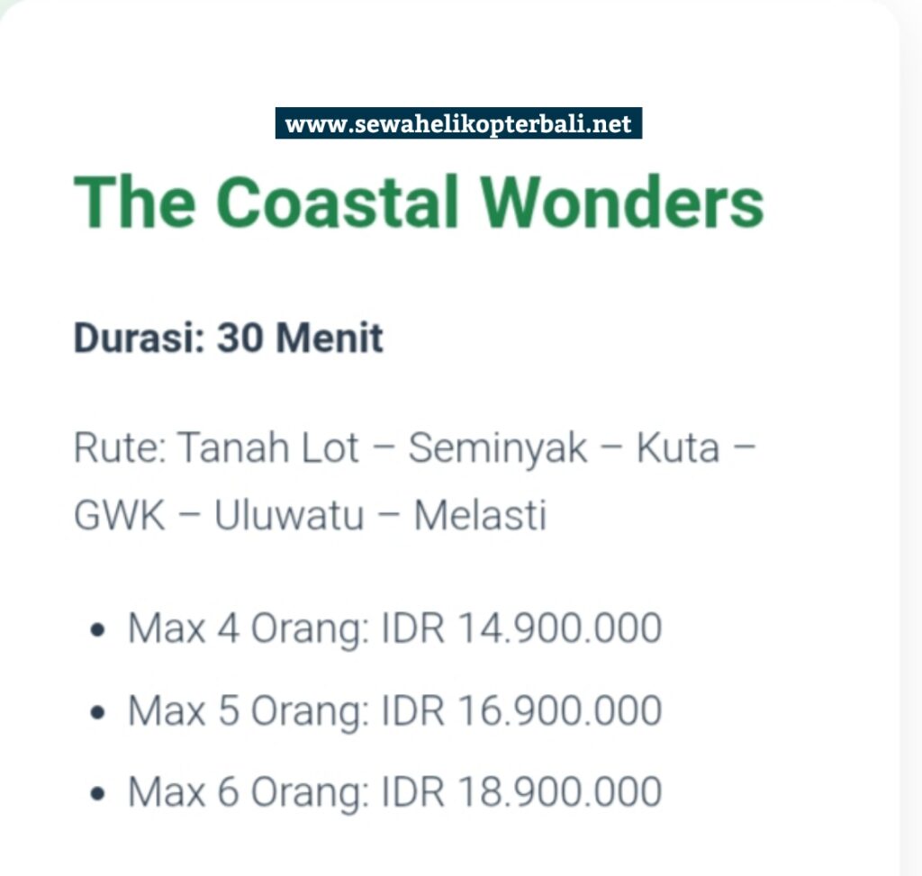 Dengan menggunakan jasa persewaan helikopter di Bali maka temen2 yang lagi jalan2 Bali bisa menikmati keindahan Uluwatu, Tanah Lot, Seminyak, Kuta hingga sampai Melasti. Wuihhh keren banget lah. Cukup dengan 14,9 juta aja udah bisa ajak 3 temanmu naik helikopter bareng. Kerennn banget gak tuh ! nanti bisa foto-foto cakep di udara…bisa lihat cakepnya Seminyak sama Tanah Lot dari atas… dijamin kamu puasss banget !